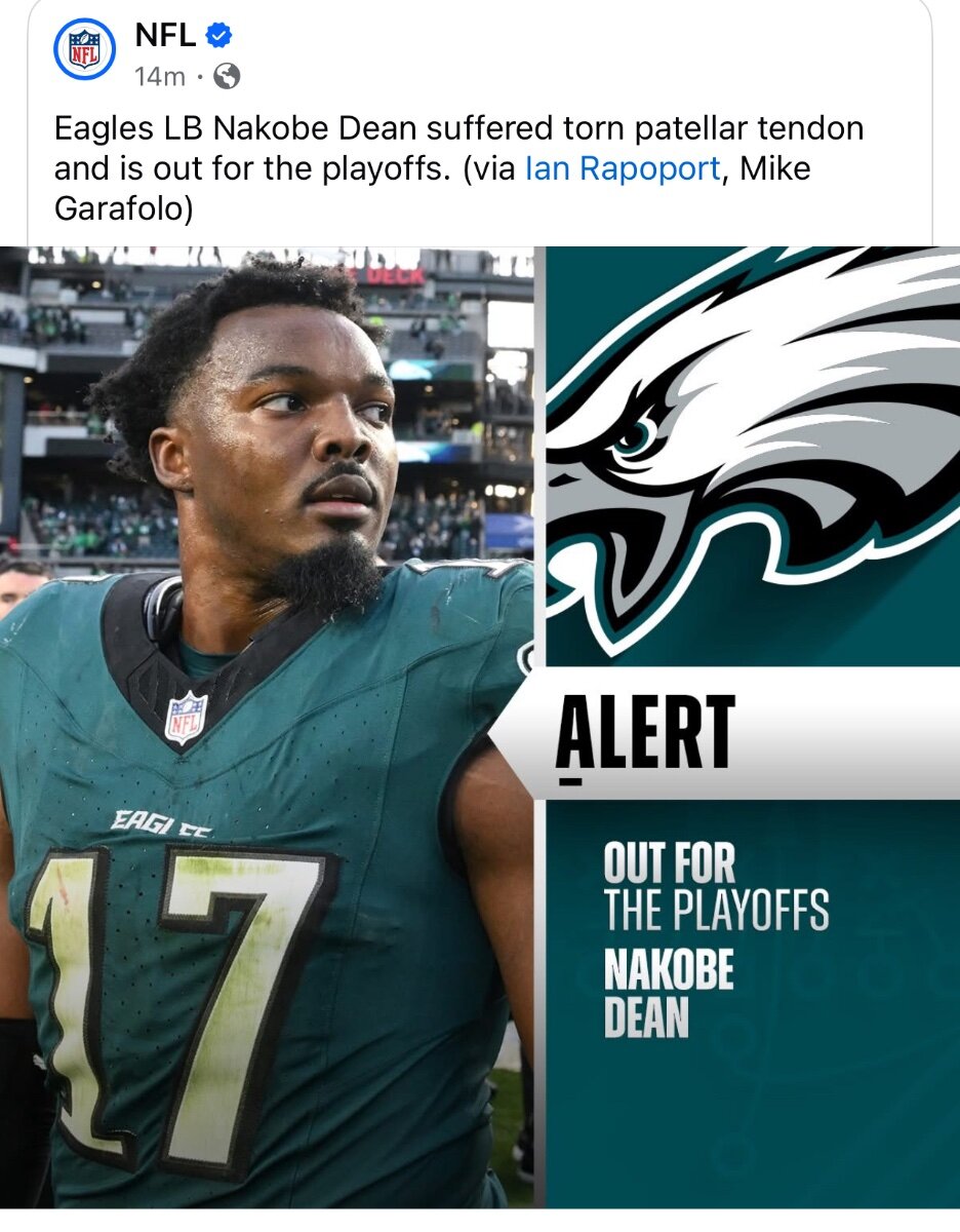 January 13Jan 13 Author Eagles fear Nakobe Dean will miss remainder of playoffs with knee injury If the Eagles are going to win the Super Bowl, it appears they’re going to have to do it without linebacker Nakobe Dean. The Eagles fear Dean’s knee injury is going to keep him out for the rest of the playoffs, according to NFL Network. Dean is set for an MRI today to get a full diagnosis, but the injury looked bad and the Eagles quickly ruled him out of Sunday’s game against the Packers. Dean started 15 games and was second on the team with 128 tackles during the regular season. He’ll be a big loss to their defense as they prepare for a divisional round game against the winner of tonight’s game between the Vikings and Rams. https://www.nbcsports.com/nfl/profootballtalk/rumor-mill/news/eagles-fear-nakobe-dean-will-miss-remainder-of-playoffs-with-knee-injury