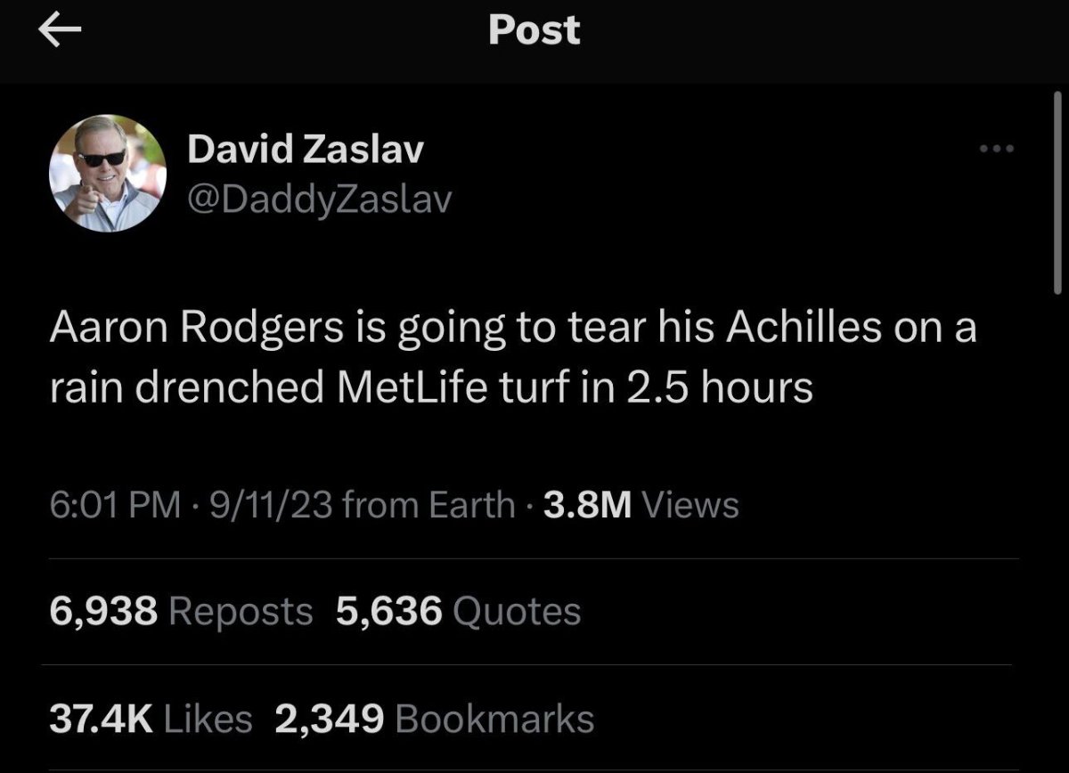 September 14, 20232 yr This is crazy https://www.mediaite.com/sports/twitter-suspends-account-of-user-who-predicted-aaron-rodgers-torn-achilles-with-freaky-precision/ Twitter Suspends User Who Predicted Aaron Rodgers Torn Achilles With Freaky Precision Today https://wbd.com/leadership/david-zaslav/
